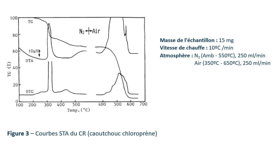 Pour l’analyse du caoutchouc naturel, la mesure a d’abord été effectuée sous azote jusqu’à 550ºC. Ensuite la température a été abaissée à 300ºC et l’azote a été remplacé par de air avant de remonter à 700ºC. La courbe TG sous azote montre que l’échantillon de caoutchouc naturel a perdu 56% de sa masse à 550ºC. Ceci est dû à la décomposition et à la gazéification du polymère et des plastifiants. Lorsqu’il est chauffé sous air, l’échantillon perd 40% de sa masse et présente un fort pic exothermique entre 500 et 630ºC. Cela est dû à l’oxydation et à la décomposition du noir de carbone, qui a été ajouté au caoutchouc naturel en tant qu’extendeur.