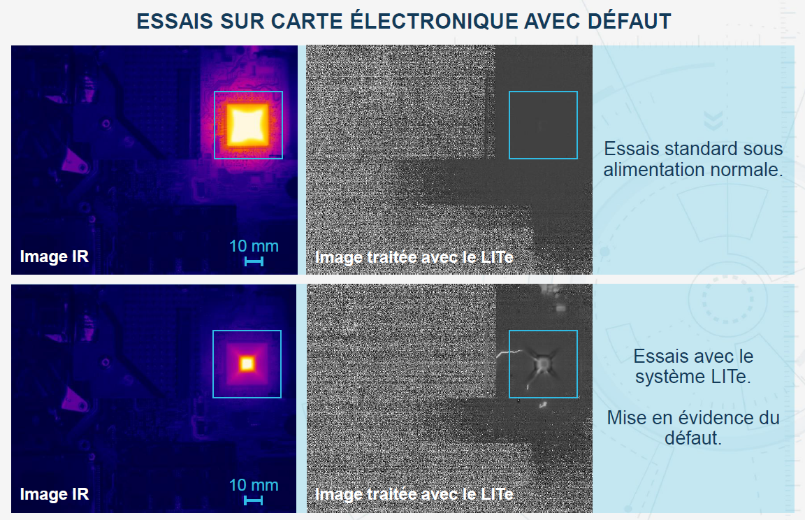 Le LITe est un système CND qui permet l’analyse de défauts présents dans les composants électroniques, en permettant une localisation très précise des points chauds de ces composants. En s’affranchissant des problèmes d’émissivité, cette méthode permet de vérifier l’intégrité des composants électroniques en détectant les défauts pouvant nuire à leur fonctionnement : défaillance, malfaçon, détérioration, usure, …