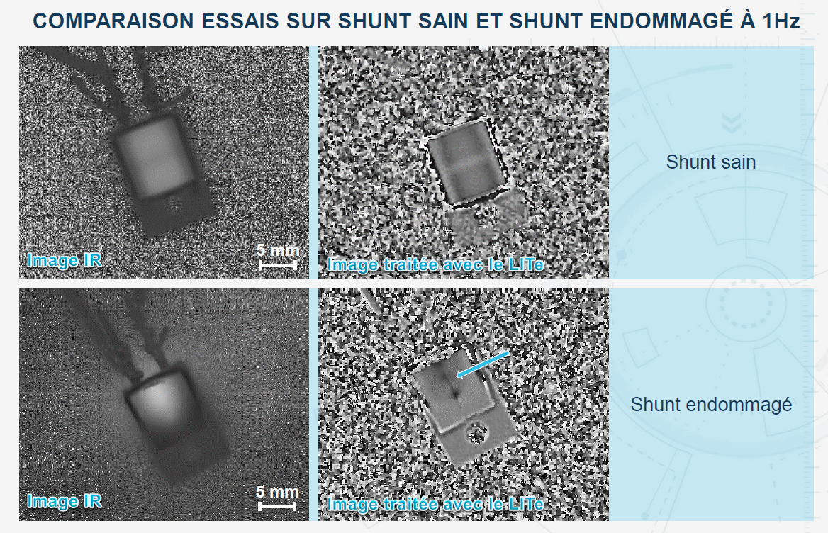 Le test sur le shunt endommagé, en comparaison avec un shunt sain, montre une localisation du défaut plus précise avec une image traitée avec le système LITe qu’avec une image infrarouge classique.